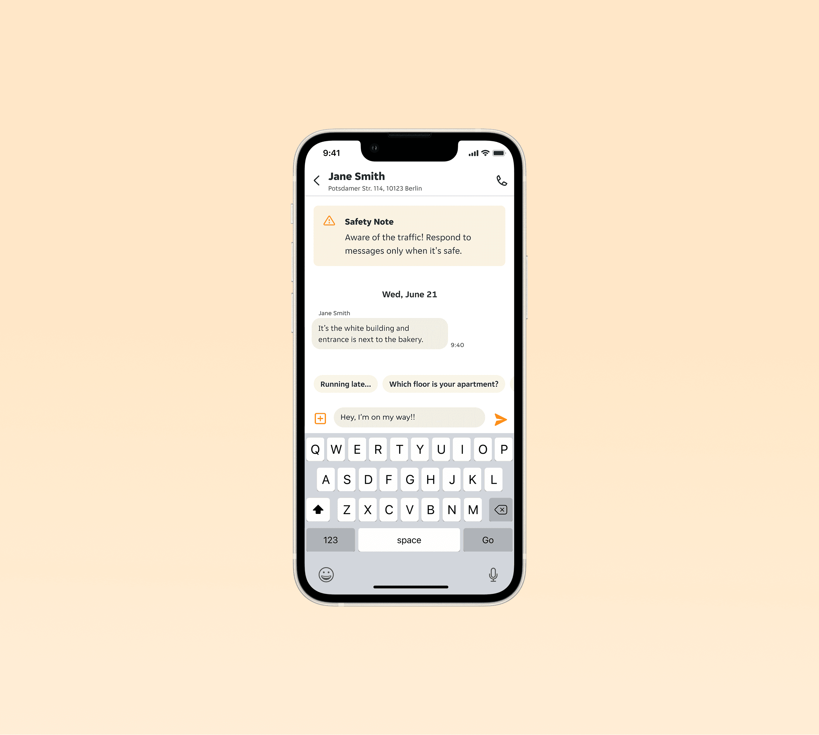 Sendbird was integrated into the Lieferando app with a single, clear entry point for couriers to start a chat with customers, reducing decision-making and friction during delivery. Chat availability is triggered automatically through geofencing when the delivery starts, allowing customers to see the chat icon at the right moment without manual setup.